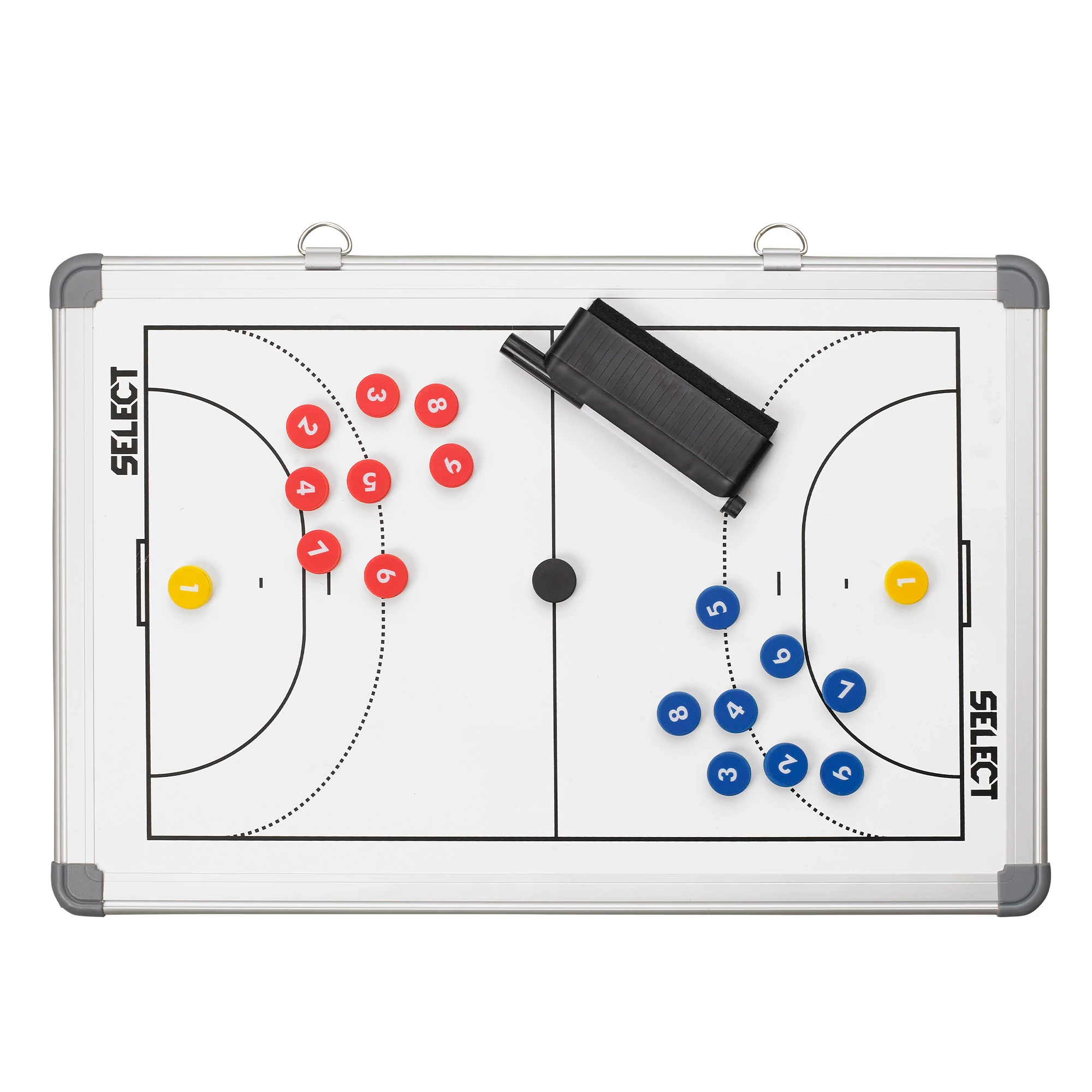Ez a sokoldalú, mágneses taktikai tábla praktikus hordtáskában érkezik, így könnyen szállítható és bármikor bevethető edzéseken vagy mérkőzések előtt. Az egyik oldalon teljes pályás, a másikon félpályás ábrázolással rendelkezik, így rugalmasan használható különféle helyzetek elemzésére.